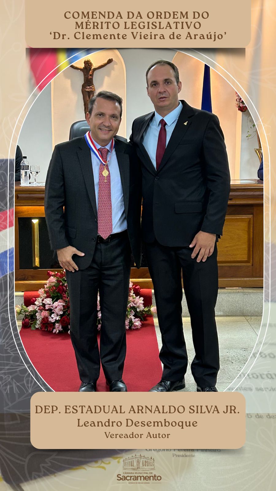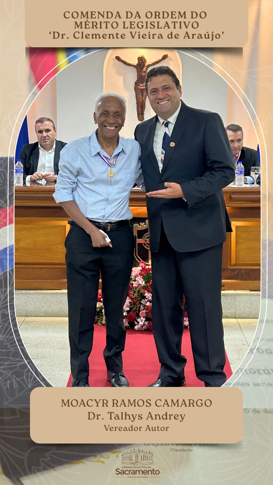 A Câmara Municipal de Sacramento realizou, nesta quinta-feira, 11 de dezembro, a Sessão Solene de outorga do Título de Cidadania Honorária de Sacramento e da Comenda da Ordem do Mérito Legislativo “Dr. Clemente Vieira de Araújo”. Estiveram presentes os vereadores da Casa; prefeito Osmar Trevisan Júnior; deputado estadual Arnaldo Silva Jr., um dos condecorados com a honraria maior da noite; representantes do Poder Judiciário; homenageados e seus familiares; e demais cidadãos.